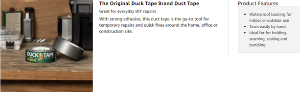 Available in a wide variety of strengths and technologies, Duck Tape Brand duct tape is relied upon as a trusted, must-have tool for just about any application. Because of its strength and adhesive properties, you can use All-Purpose Duck Tape for almost any job, including everyday household and auto repairs--anywhere a flexible and weather-proof bond is needed. All-Purpose Duck Tape has a thick, heavy-duty adhesive applied to a waterproof cloth backing for extra durability and to resist delamination in direct sunlight.