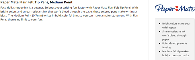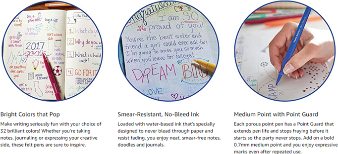 Fact: Dull, smudgy ink is a downer. So boost your writing fun factor with Paper Mate Flair Pens. With a rainbow of bright colors and smear resistant ink that won’t bleed through the page, these colored pens make writing a blast. The medium point (0.7 mm) writes in bold, colorful lines so your self-expression makes a major statement. The best part of all? Everything you can create—whether you’re taking notes, bullet journaling, drawing, doodling, or doing anything else that inspires you. With Paper Mate Flair Pens, there’s no limit to your fun.