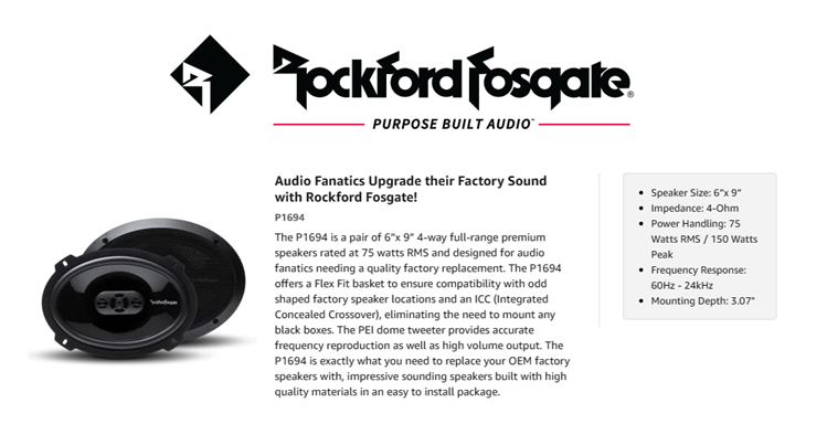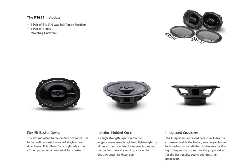 - The P1694 6”x9” 4-Ohm black speakers come as a pair, have a power handling of 75 Watts RMS/150 Watts Max and include grilles, mounting hardware and OEM adapter plate