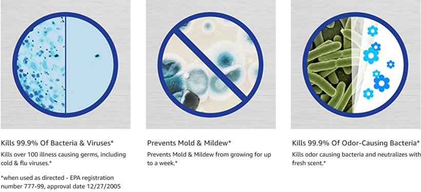 Kills 99.9 percent of mildew, mold, viruses, and bacteria with inviting crisp linen scent.