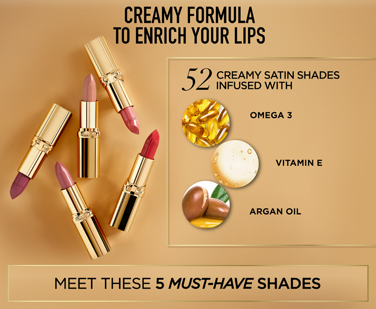 - Colour Riche Lipcolor: Indulge in richness beyond compare with our most luxuriously rich color and hydration; Colour Riche Lipstick is enriched with nourishing ingredients like Omega 3, Vitamin E, and Argan Oil to soften lips