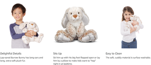 Lop-eared Burrow Bunny has long ears and long, extra-soft plush fur. Sit him up with his big feet flopped open, or lay him by a pillow to make kids want to hop right into bed. Children will love the kind features and irresistibly soft plush of this charming rabbit stuffed animal. This furry bunny rabbit stuffed animal has been designed with high-quality materials that will hold up against constant cuddling. The soft polyester fabric makes it ideal for snuggle time, yet durable enough to last for extended use. This Melissa & Doug bunny rabbit stuffed animal gives kids many entertainment options. Children can snuggle with their bunny during story time, enjoy pretend play, and even read a story to their fuzzy friend. The Melissa & Doug Burrow Bunny Rabbit Stuffed Animal makes a delightful and cuddly gift for kids all ages. Add the Melissa & Doug Tiger Stuffed Animal to round out the hands-on play experience and give kids another engaging option for screen-free fun. For more than 30 years, Melissa & Doug has created beautifully designed imagination- and creativity-sparking products that NBC News called “the gold standard in early childhood play.” Today, Melissa & Doug is proudly partnering with the American Academy of Pediatrics to foster early brain development and help children build important life skills through play.