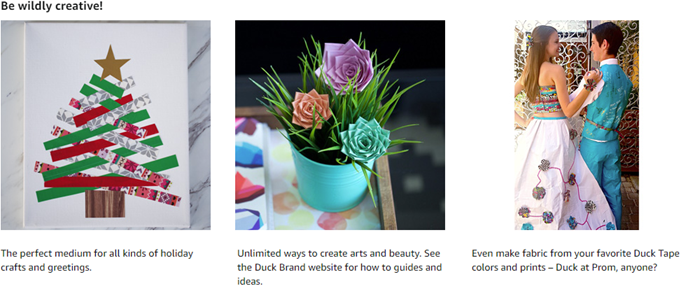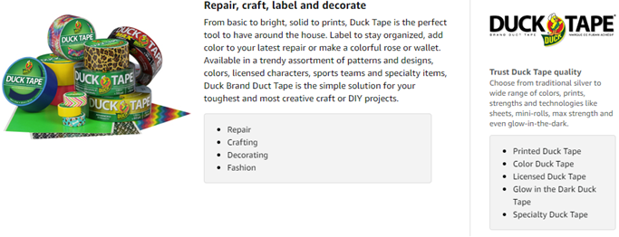 Almost everyone has a Duck Tape story to tell, usually praising its remarkable strength and versatility. Duck Brand duct tape has a wide range of applications, both traditional and nontraditional, and is now available in dozens of colors and patterns, making it even more useful than ever! Because of its strength and adhesive properties, you can use Color Duck Tape for almost any job, including everyday household and auto repairs--anywhere a flexible and weather-proof bond is needed. Great for temporary indoor floor marking and removes cleanly from most surfaces up to 3 weeks. Not recommended for hardwood floors or in direct sunlight. Color Duck Tape is great for coordinating materials, color-coding and identification, craft applications, and more. This heavy duty tape is cotton mesh reinforced, but still easy to tear! Duck Tape conforms to both smooth and uneven surfaces, and can be used on materials such as cloth, vinyl, leather and plastic - even metal and laminates. Duck Tape is great for any repairs - anywhere!