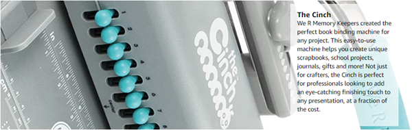 The Cinch Book Binding Machine by We R Memory Keepers makes booking binding quick, easy and affordable. It is the best binding tool on the market for home, school and office projects. Punch perfect holes with customizable hole spacing on any size project. The Cinch is great for making mini albums, recipe books, presentations and more. Find out for yourself why scrap bookers, crafters and mix media artists are trading in their old binding systems for the Cinch.