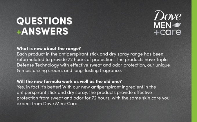 - 1/4 MOISTURIZING CREAM: Dove Men+Care antiperspirant uses our exclusive care for comfortable underarms all day