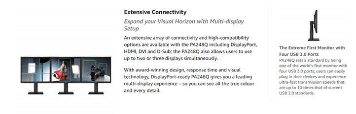 • The world's first monitor with four USB 3.0 ports for 10X faster transfer. Extensive connectivity with HDMI, D-Sub, DisplayPort, DVI-D, USB 3.0 x4.