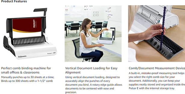 The full-featured, medium duty Fellowes Pulsar Plus Comb Binding Machine is ideal for general office use. Compact machine manually punches up to 18 sheets at a time and binds up to 300 sheets with a 1-1/2-Inch comb. Vertical document loading ensures accurate punch alignment. Efficient design allows user to punch and bind in a continuous manner. Features built-in comb storage tray with document measurement device for added convenience and quick set-up. Adjustable edge guide centers documents with ease. Includes binding starter pack (contents: 10 pk assorted kit).