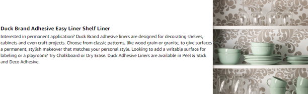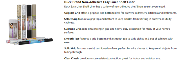 The Duck Brand offers quality, care and extraordinary value to consumers looking for friendly and convenient solutions to everyday problems. Each Duck Brand Non-Adhesive Select Easy Shelf Liner features a non-adhesive grip top and bottom. It is ideal for under electronics, small appliances or accessories, or inside shelves, drawers, placemats or coasters. This shelf liner has a consistent uniform pattern and offers more cushioning than The Duck Brand Original Easy Liner Shelf Liner. The Duck Brand Non-Adhesive Select Easy Shelf Liner is simple to cut and install and is machine washable. The Duck Brand has been delighting consumers with quality products for over 20 years and continues to innovate and offer solutions for the household.