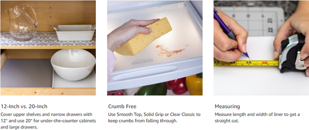 Featuring a non-adhesive grip top and bottom, you can use Select Grip EasyLiner Brand Shelf Liner in almost any type of drawer or utility cabinet to protect against scratches and keep your items in place. This shelf liner is easy to remove or replace and is available in a variety of colors, making redecorating a breeze. Pro Tip: Cover narrow drawers and cabinets with 12" and use 20" for large drawers and cabinets.