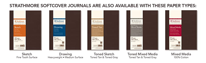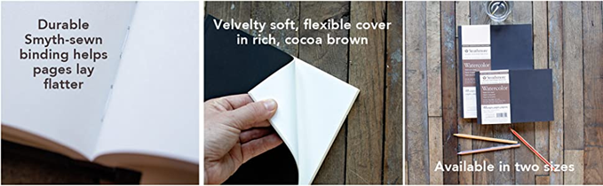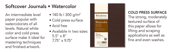 The Strathmore 400 Series Watercolor Softcover Art Journal contains Strathmore's intermediate grade of watercolor paper, which is popular with watercolorists of all levels because of the fine and even washes that can be achieved. The paper has a strong natural white and traditional cold press surface that makes it ideal for lifting and scraping applications, mastering watercolor techniques, or for finished artwork. Softcover Art Journals have a velvety softcover in rich dark brown, and feature durable Smyth-sewn binding, allowing pages to lay flatter.