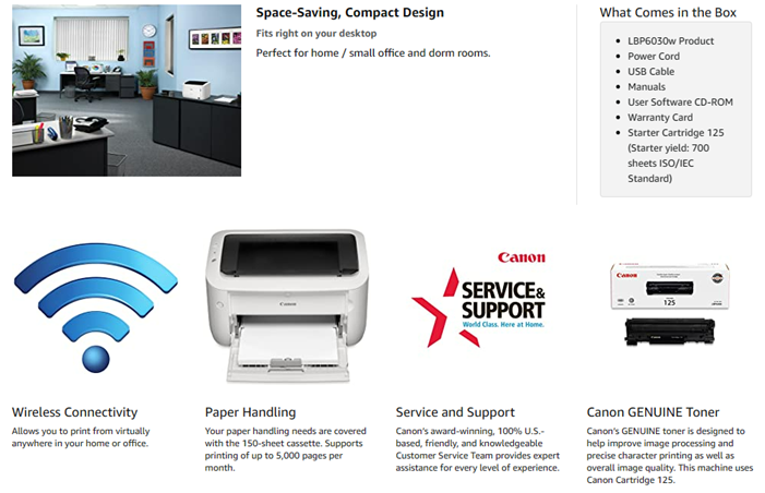 - FAST PRINT SPEEDS: Print up to 19 pages per minute.Print from almost anywhere in your office with wireless connectivityThe single cartridge system combines the toner and drum into one unit, making cartridge replacement simpleIn The Box : imageCLASS LBP6030w product, Starter Cartridge 125, Power Cord, USB Cable, User Manual, User Software CD-ROM, Warranty Card