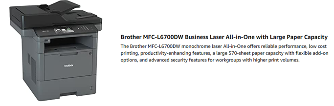 The Brother MFC-L6700DW Business Laser All-in-One is also Amazon Dash Replenishment enabled, which means that you never have to run out of toner when you activate this automatic fulfillment system. This Brother all-in-one is backed by a one-year limited warranty and free at-your-side support for the life of your product, featuring online, phone, or live chat assistance.