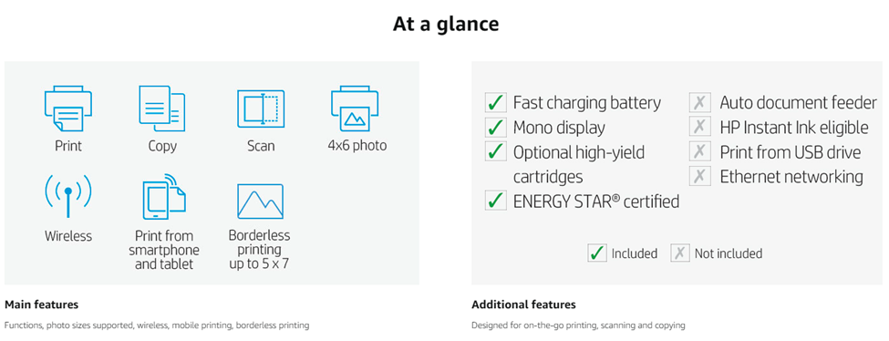 - Main functions of this HP all-in-one portable printer: scan, copy, easy portable printing wherever you need it, wireless Print from your laptop or mobile devices, 2. 65" Color touchscreen, auto document feeder, and more