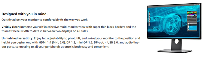 Beauty without borders The Dell UltraSharp 24 InfinityEdge Monitor | U2417H takes your view to the edge with 45% less black borders than Dell's previous 23 8" monitor Seamless and precise The World's first InfinityEdge Monitor has the world's thinnest borders on all sides of the screen creating an almost seamless multi-monitor view Designed with purpose Multiple adjustability options allow you to tilt pivot swivel and adjust the height of the monitor to best fit the way you work Unmatched reliability Get complete peace of mind with Dell's Premium Panel and Advanced Exchange Service