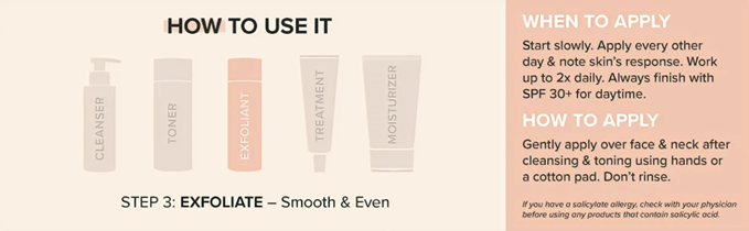 • Dramatically improves skin's texture for radiant youthful even-toned skin. Beta hydroxy acid (BHA also known as salicylic acid) mimics the natural exfoliation process of younger skin by helping it shed extra layers while unclogging and clearing pores.