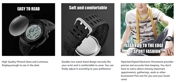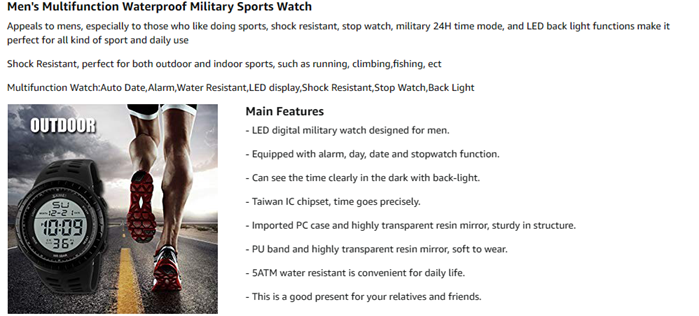 Fashionable sports dial design, military-style outlook. A smooth band, simple to figure out how to use, multifunction and Large Dial and numbers with light, you can see the time display brightly and clearly at dark. This Outdoor sports watch is a good choice for all ages. All these features provide good wearing experience.