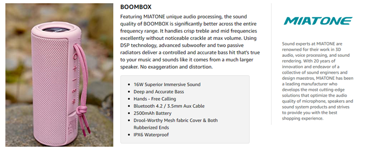 - [Immersive Sound] Featuring MIATONE unique audio processing, the sound quality of BOOMBOX bluetooth speaker is significantly better across the entire frequency range from dual precision acoustic stereo drivers. It handles crisp treble and mid frequencies excellently without noticeable crackle at max volume. Using DSP technology, dual advanced subwoofers and aluminum passive radiators on each ends boost deep and accurate bass that's true to your music. No exaggeration and distortion.