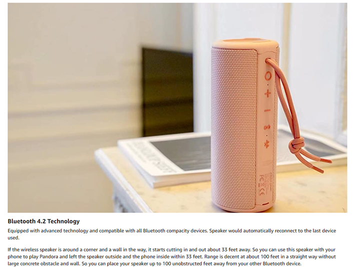 - [Bluetooth V4.2 Range Testing] If the wireless speaker is around a thick concrete corner/ wall in the way, it starts cutting in and out about 33 feet away. So you can use this speaker with your phone to play Pandora and left the speaker outside and the phone inside within 33 feet. Range is decent at about 100 feet in a straight way without concrete obstacle and wall. So you can place your speaker up to 100 unobstructed feet away from your other Bluetooth devices.
