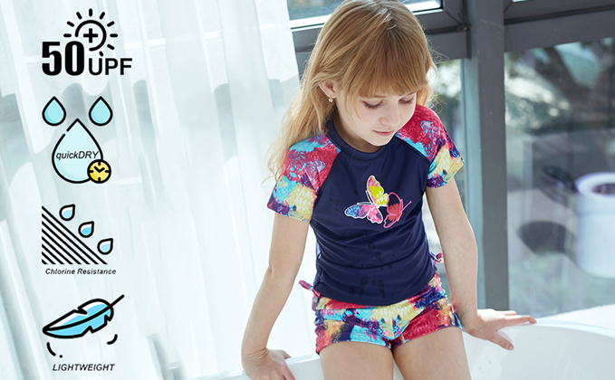 PHIBEE Girls' Short Sleeve Rash Guard Set UPF 50+ Sun Protection Two-Piece Swimwear