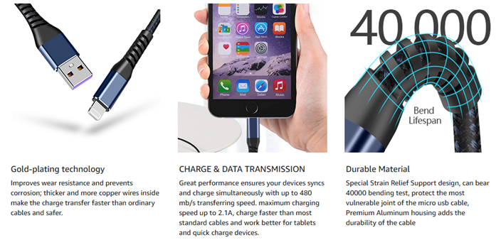 Improves wear resistance and prevents corrosion; thicker and more copper wires inside make the charge transfer faster than ordinary cables and safer.