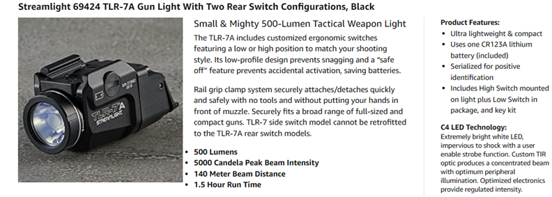 The TLR-7 A includes a customized ambidextrous on/off rear switch in either a Low or High option to match your shooting style. It features a rail clamp that is designed to rapidly attaches/detaches quickly and safely with no tools and without putting your hands in front of muzzle. Securely fits a broad range of full-sized and compact guns. Durable, anodized machined aluminum construction and user enabled strobe function. Engineered optic produces a concentrated beam with optimum peripheral illumination. 2.58-Inch (6.55 cm); 2. 4 oz (68.1g).