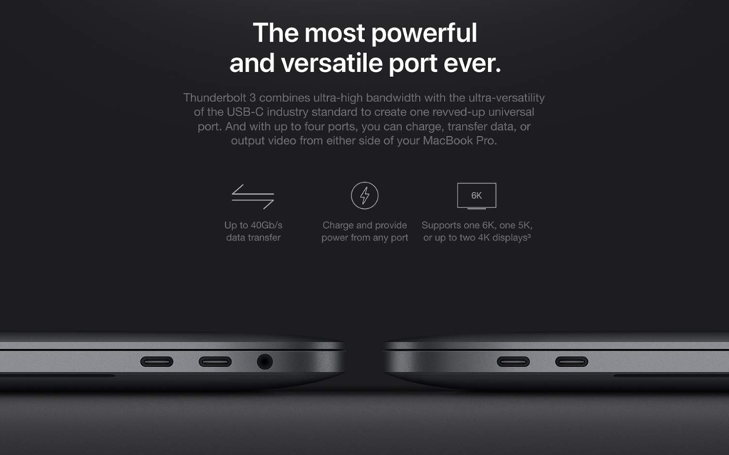Charging and Expansion | Two Thunderbolt 3 (USB-C) ports with support for: Charging, DisplayPort, Thunderbolt (up to 40 Gbps), USB 3.1 Gen 2 (up to 10 Gbps) |