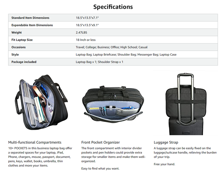 - Material: High quality Water-repellent 1680D ballistic fabric, which is durable, classic and eco-friendly. Dimensions: 18.5"x13.5"x7.1". Weight: 2.47LBS.