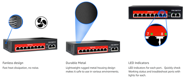 【8 port poe switch*100M@120W 】PoE switch with 8 port PoE + 2 Uplink port,8× PoE ports providing up to 30W per port, total PoE budget 120W,2 port uplink ideal for connecting NVR and Internet, etc.