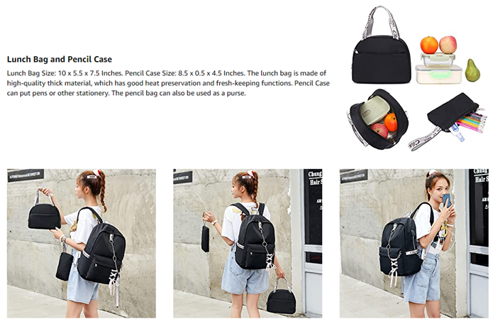 LAPTOP BACKPACK with LUNCH BAG and PURSE: Girls Backpack: 12 x 5.5 x 16.5 Inches. Lunch Bag: 10 x 5.5 x 7.5 Inches. Pencil case or Purse: 8.5 x 0.5 x 4.5 Inches. The backpack set could be compatible for upmost 15.6 Inch Laptops/Macbooks/computers, it has enough space and pockets for charger, binders, books, clothes and other various necessities. The lunch bag is made of high-quality and environmentally-friendly thick material, which has good heat preservation and fresh-keeping functions.