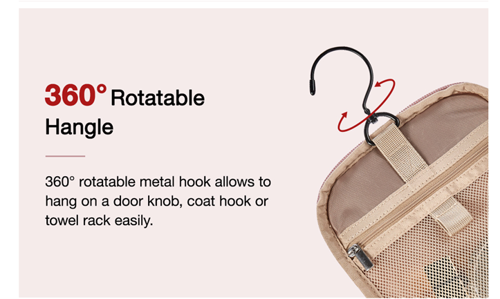 Special Design - Inner pockets with elastic straps hold bottles upright. Two side pockets of travel toiletry bag can keep the wet/dry items separated. The right side pocket with PVC material is easy to clean and dry, perfect for makeup brushes, toothbrushes, wet towels. Stow-away 360 degree swivel non-slip metal hook for versatile hanging options.Can be gifts for Women on Black Friday,Cyber Monday,Christmas day.