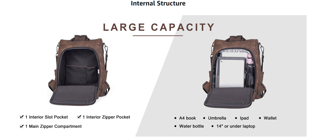 [Large Capacity]: 1 back & 2 front zipper pockets, 1 inner zipper & 2 slot pockets, 2 side pockets,1 lock buckle pocket. Storage capacity is pretty respectable,Plenty of room to carry the usuals -14" or under laptop, iPad, Phone, Wallet, Sunnies, A couple pens,Keys.Keeping everything neat and organized!