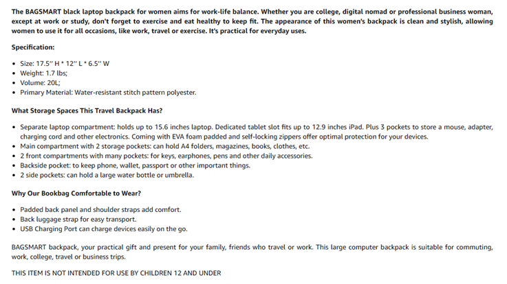- Large Capacity: Dimensions 18.5 * 12.5 * 7 inches, The laptop backpack has multiple divider pockets, The laptop compartment with anti-theft zippers is suitable for a laptop up to 15.6", padded with EVA foam can offer optimal protection for your laptop. Tablet slot fits up to 12.9’’ iPad. Mesh pockets for mouse, adapter, and charging cord. Large main compartment roomy for daily necessities, such as A4 folders, textbooks, magazines, chargers, power bank and clothes