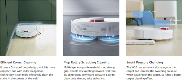 - 【Sweeping, Mopping, Washing, and Drying 4-in-1】 Intelligent return cleaning of the mop and hot air drying make your cleaning healthier and cleaner. the W10 robot vacuum is equipped with a 4L clean tank and a 4L sewage tank, no need to change the water frequently, free your hands.