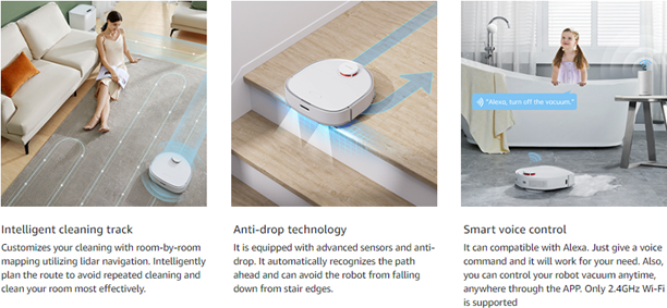 - 【Wifi & Smart Voice App Control】W10 is compatible with Alexa & Google Assistant. App remote control allows you to adjust suction power, set virtual No-Go zone, and zone clean, multi-layer maps, schedule cleaning, etc; Once connected to Alexa, the robot responds to your voice orders immediately, which makes your cleaning more intelligent; W10 Robot Vacuum works with 2.4GHz Wifi