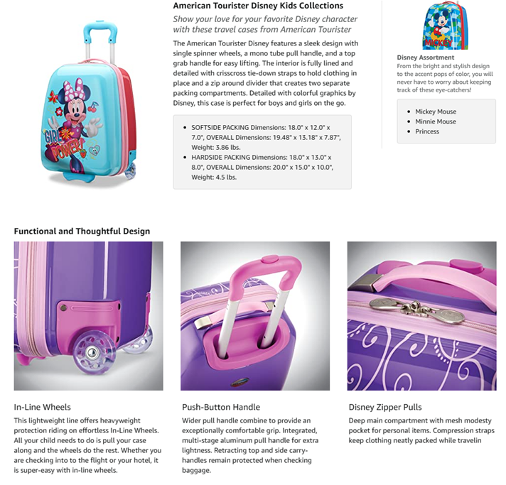 Show your love for your favorite Disney character with this hardside upright travel case from American Tourister. The American Tourister Disney 16" Upright Hardside is made from lightweight and durable ABS material and features a sleek hardside design with side-mounted skate wheels, a mono tube pull handle, and a top grab handle for easy lifting. The interior is fully lined and detailed with crisscross tie-down straps to hold clothing in place and a zip around divider that creates two separate packing compartments. Detailed with colorful graphics of your favorite Star Wars characters, Disney princesses, and other Disney stars, this case is perfect for boys and girls on the go. Pack more fun with this Disney luggage!