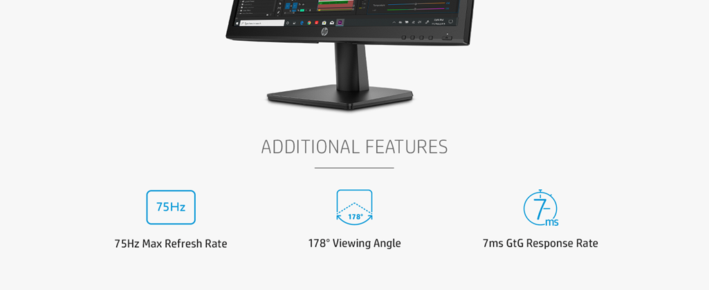 Browse the web, stream your shows, and get work done on the everyday HP V223ve FHD Monitor. This HP computer monitor’s 21.5-inch Full HD screen boasts unparalleled visuals every time you turn it on (1). What’s more is that the 1080p monitor features a 75Hz refresh rate for smoother images, plus a superb contrast ratio for better color differentiation (2). No matter where you view your HP monitor, the VA panel ensures image clarity is maintained across ultra-wide 178-degree horizontal and vertical viewing angles. Easily connect a laptop, an external storage drive, or an additional monitor with the HDMI and VGA ports. Get the most out of a PC monitor designed for both comfort and efficiency. The TÜV certified Low Blue Light Mode limits the strain put on your eyes, while the tilt-adjustable display ensures comfortable posture all day. Beyond this HDMI monitor’s comfort settings, the narrow bezel design keeps things stylish and productive, letting you see more of your favorite show or word document. Customize your display with ease thanks to the intuitive HP Display Center software; through the host PC, you can personalize every little detail from display settings, screen partitioning, and even dimming the screen. Further customize the way you use this monitor with standard 100 x 100 millimeters VESA mounting options (3). This 75Hz monitor’s energy-efficient design isn't just for you but the environment too, as your device reduces power consumption and energy costs. Plus, the materials used in the packaging are 100% sustainably sourced and recyclable (4). Rest easy as your monitor is covered by an HP 1-year limited hardware warranty. (1) Full high-definition (FHD) content is required to view FHD images. (2) During video playback only, depending on series of frames or time duration. (3) Bracket not included. (4) 100% outer box/corrugate cushion packaging made from sustainably sourced certified and recycled fibers. Fiber cushions are made from 100% recycled wood fiber and organic material. Excludes plastic bags and plastic foam sheeting. 06/04/2021_r1 tg.