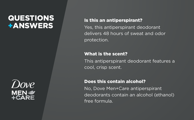 Looking for an antiperspirant for men that's designed to keep you feeling fresh and confident? Try Dove Men+Care Clean Comfort Antiperspirant Deodorant Stick. Our Clean Comfort antiperspirant deodorant provides powerful 72-hour protection against sweat and odor while caring for your skin. This antiperspirant for men is formulated with 1/4 Moisturizing Cream to deliver skin moisturization for more comfortable underarms. Discover Dove Men+Care Clean Comfort Antiperspirant Deodorant's long-lasting subtle fragrance to refresh your senses and leave you feeling fresh all day. Simply apply Dove Men+Care Clean Comfort Antiperspirant Deodorant in an even layer onto each of your underarms for best results. You now have the powerful protection you need to stay fresh and feel confident all day. Dove care goes further than moisturizing protection with PETA Cruelty-Free certification and recyclable plastic packs. Looking for more Dove Men+Care skin care products? Try the full range of Dove Men+Care products, including deodorants, antiperspirants, dry spray antiperspirant deodorants, body washes, face and body bars, and hair care products. Dove care goes further than moisturizing protection with PETA Cruelty-Free certification and recyclable plastic packs.