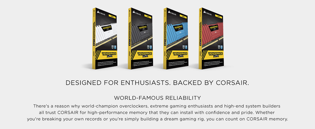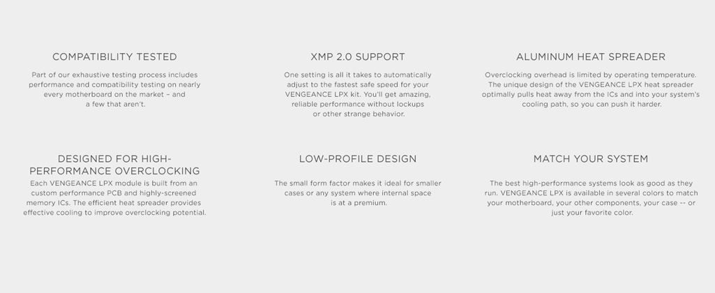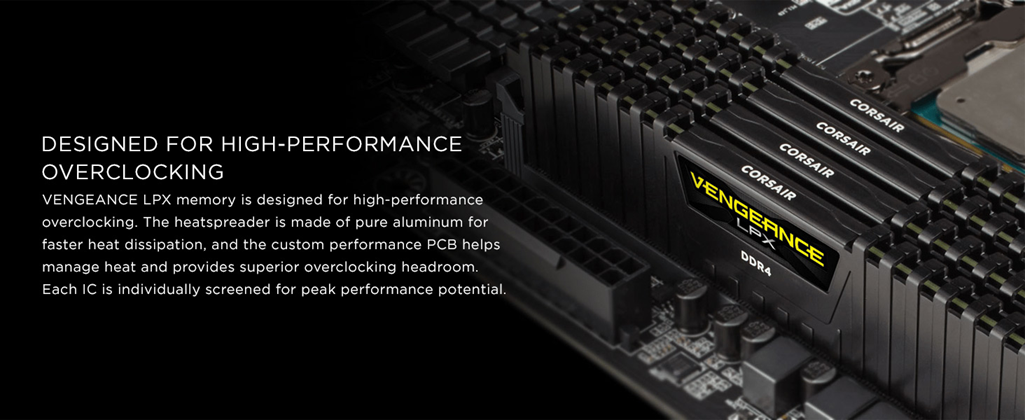 Vengeance LPX memory is designed for high performance overclocking. The heat spreader is made of pure aluminum for faster heat dissipation, and the eight layer PCB helps manage heat and provides superior overclocking headroom. Each IC is individually screened for performance potential. The DDR4 form factor is optimized for the latest Intel 100 Series motherboards and offers higher frequencies, greater bandwidth, and lower power consumption than DDR3 modules. Vengeance LPX DDR4 modules are compatibility tested across 100 Series motherboards for reliably fast performance. There's XMP 2. 0 support for trouble free automatic overclocking. And, they're available in multiple colors to match your motherboard, your components, or just your style. Memory Configuration Dual / Quad Channel. Compatibility : Intel 100 Series,Intel 200 Series,Intel 300 Series,Intel 400 Series,Intel 500 Series,Intel 600 Series,Intel X299.