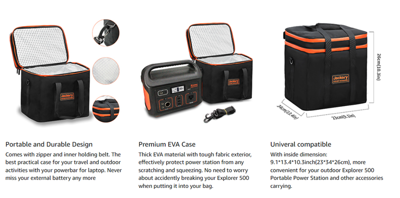 The Jackery Hard Carrying Case is a good choice for your outdoors travel with Jackery Explorer 500 Portable Power Station. Thanks to its exclusive design, the EVA case provide durable protector for your Explorer 500 Portable Power Station. Designed especially to fit the E500, this soft-lined case features an inner compartment for wall charger and USB cable.