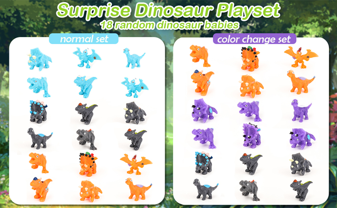 18 dinosaur eggs, 18 random small dinosaurs and 6 dinosaur egg slots. Children don't know what type of dinosaur is inside the egg until they open it.