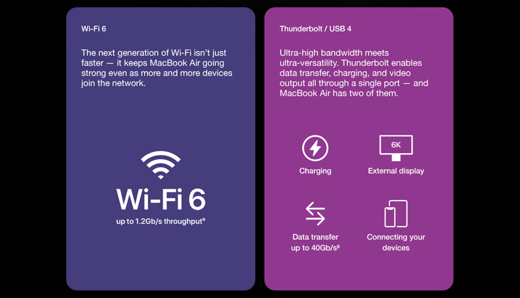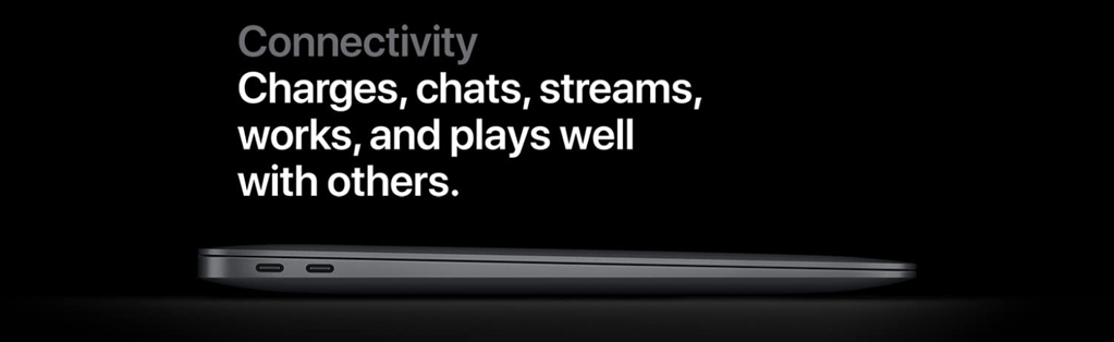 Charging and ExpansionTwo Thunderbolt / USB 4 ports with support for: Charging, DisplayPort, Thunderbolt 3 (up to 40 Gbps), USB 3.1 Gen 2 (up to 10 Gbps)