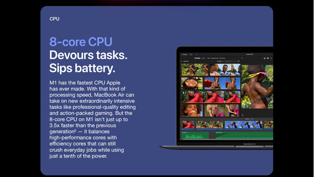 • Powerful Performance – Take on everything from professional-quality editing to action-packed gaming with ease. The Apple M1 chip with an 8-core CPU delivers up to 3.5x faster performance than the previous generation while using way less power.
