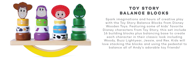 Spark imaginations and hours of creative play with the Toy Story Balance Blocks from Disney Wooden Toys. Featuring some of kids’ favorite Disney characters from Toy Story, this set include 16 building blocks plus balancing base to create each character in their classic look including Woody, Buzz Lightyear, Jessie, and Rex. Kids will love stacking the blocks and using the pedestal to balance all of Andy’s adorable toy friends! These wooden blocks encourage little ones to use their imagination during free play and helps develop fine motor skills. Build out a world of fun when you introduce this classic play experience into your child’s playtime, including wooden figures, blocks, balancing blocks, cars, trains, puzzles, and clutch toys. Collect both Disney Wooden Toys Balancing Blocks including Winnie the Pooh and Toy Story. Ages 18+ months