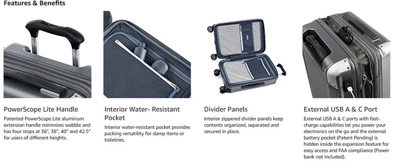 Stylish, ultra-durable and loaded with features, the Platinum® Elite Expandable hard shell carry on luggage offers all the modern conveniences you want in a sophisticated carry-on that adapts when you need more packing space. This travel suitcase lets you power your electronics on the go using external USB A & C ports with fast-charge capabilities and a dedicated external-access battery pocket (patent pending) that provides FAA-compliant storage for your power bank. Carry on luggage with spinner wheels is sizer bin tested to fit in the overhead bins of most major domestic airlines, this carry-on also offers a zippered 2” expansion option to increase packing capacity when needed. Designed for great looks and ultimate resilience, this hardside luggage is durably constructed with an ultra-strong, easy-to-clean, 100% polycarbonate shell that flexes upon impact to prevent cracking and keep contents protected, while its attractive textured finish helps reduce the visibility of scuffs or scratching. Genuine leather trim adds sophistication, and distinctive aluminum corner armor protects high-impact areas in style. The built-in TSA-approved lock allows authorities secure access for inspection when required. Pack with ease inside the clamshell design with two zippered divider panels that keep contents separated and stored securely in place. This hardside carry on luggage has multiple accessory pockets that provide built-in organization, and a convenient, water-resistant pocket stows damp items or toiletries. On the move, this compact beauty flies with precise control and effortless roll, thanks to the Travelpro® exclusive PrecisionGlide™ System–eight MagnaTrac® self-aligning spinner wheels led by a sturdy, four-stop adjustable PowerScope Lite handle with comfortable Contour Grip. Hard sided luggage with spinner wheels is backed by our Built For a Lifetime Limited Warranty with the Trusted Companion Promise that even covers damage caused by airlines or other common carriers for the first five years of the lifetime warranty.