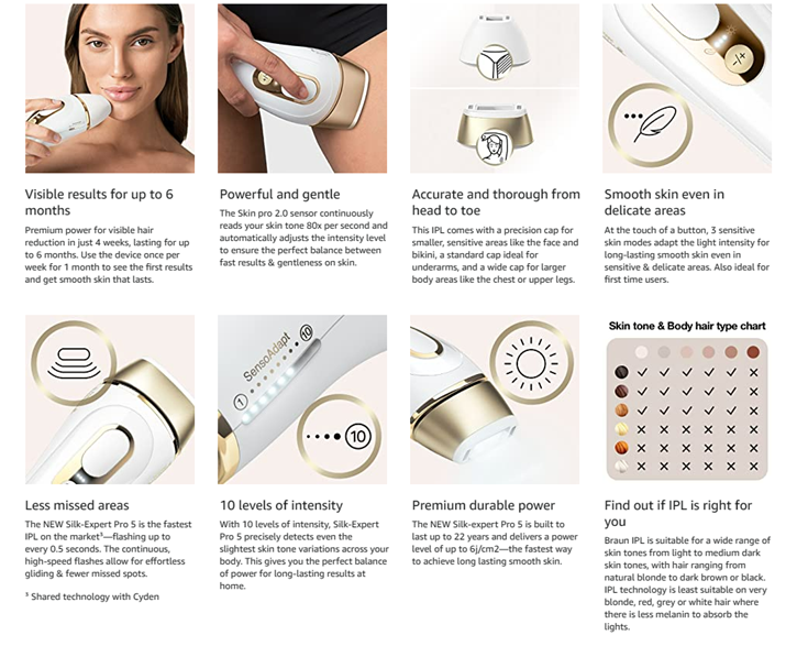 Silk·expert Pro 5 is Braun’s best IPL. This isn’t a laser hair removal device but instead uses advanced IPL technology to give you up to 6 months of smooth skin from home, with visible hair reduction in 4 weeks*. SkinPro 2.0 (SensoAdapt) automatically adapts to your skin tone, optimizing the power for the perfect balance between fast results and gentleness on skin. 2 sensitive modes ensure your skin’s comfort. Up to 125 flashes per minute enables less missed spots when gliding on your skin. *74% hair reduction after 12 weekly sessions (combined value for bikini, leg, axilla). Individual results may vary. Box Contents: 1 × Silk·expert Pro 5 with standard head 1 × Additional precision Head 1 × Venus Extra Smooth Swirl razor 1 × Soft pouch