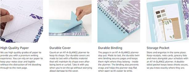 Express yourself while staying organized with an AT-A-GLANCE Wild Washes Weekly Monthly Appointment Book. It covers 13 months from January 2023 - January 2024 and is guaranteed to last all year.* Plan your schedule without fear of distracting ink bleeding. Our improved, high-quality paper is designed for superior ink bleed resistance, which keeps plans neat and legible. A cool and funky animal print design adorns the smooth, soft cover and inside pages. Each two page weekly spread has ruled columns with appointment times from 7:00 a.m. - 8:00 p.m., Monday-Friday. Weekends are untimed. Pages measure 8-1/2" x 11". Tabbed monthly two page spread has ruled daily blocks, a notes section and past/future month reference calendars. Special pages section includes a holiday listing, 3 year reference calendar, event calendar, contacts and notes. Double-sided poly pocket stores loose sheets. Ideal for transport, the flexible yet durable cover keeps its shape. Twin wire binding prevents snags and secures pages. *ACCO Brands will replace any AT-A-GLANCE planner that is returned within one year from the date of purchase. This guarantee does not cover damage due to misuse or abuse. Contact ACCO Brands Consumer Affairs at www.ataglance.com for instructions.