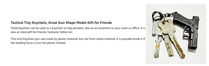 【Usages】Small pistol keychain can be used as a keychain or bag pendant, also as an ornament in your room or office. In holiday or party, it is an ideal gift.