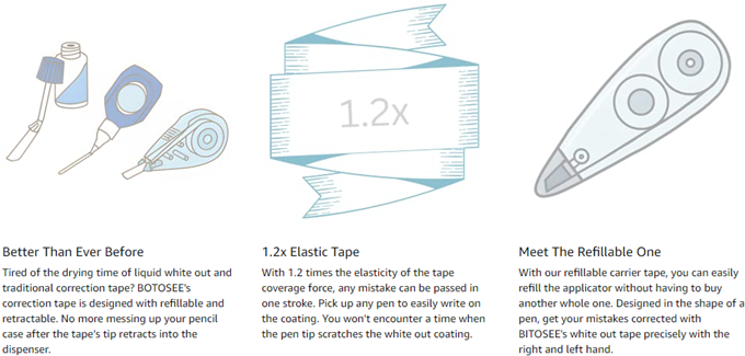 - Just like the well-received refillable feature, the BITOSEE's upgraded correction tape has the advantage of being retractable. You can retract the tip of the carrier tape into the dispenser with a single press. This way it won't mess up your stationery organizer. Included: 2 × dispensers with carrier tape installed, 2 נcarrier tapes for replacement - Tape Measures: 1/5" ×480".