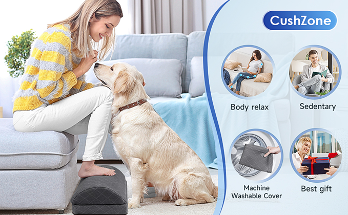 - Provides A Comfortable Sitting Position: Pain relief and support for back, hip, legs, knees & feet, the CushZone footrest will reduce pressure on your lower back and hips by cushioning the bottom of your feet to help alleviate back and sciatica pain. Our footstool will also ensure proper foot placement while sitting and correct sitting posture to help improve blood circulation in the legs and relieve pain over time.