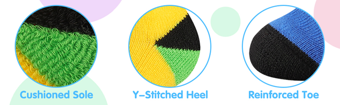 Heel TAB: Our boys socks have a thicker and higher back around ankle that prevent rubbing against your kids’ delicate skin, also the tab gives a good place for him to pull his socks on.